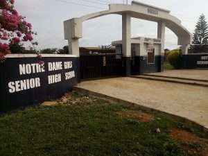 Notre Dame Girls High School was established on 28 September 1987 by the cooperative efforts of the then Catholic Bishop of Sunyani, Reverend James Kwadwo Owusu and the School Sisters of Notre Dame, Reverend Sister Dorez Mehrtens and Chiefs and people of Fiapre with an initial number of 37 females. The first cramped temporary premises of the school were in a renovated technical school near St. Patrick's Primary and Junior Secondary School behind the Christ the King Cathedral in Sunyani. The school has passed under the leadership of four substantive Headmistresses, the first three of whom were School Sisters of Notre Dame. The pioneer Headmistress was Rev. Sr. Joan Schaeffer, SSND with Rev. Sr. Mary Busson SSND as the Assistant Headmistress. The two were joined by two Rev. Sisters namely Sr. Therese Nowakoski SSND and Sr. Dorothy Ann SSND and three lay personnel as the teaching staff. The first students enrolled generally were those who would have been rejected by the well endowed schools in Ghana. The plan was to locate the school in Fiapre where the Chief and the Fiapre Community had donated the land. Progress on the Fiapre site developed very slowly due to limited funds. Construction commenced in 1992 and only in 1996 did the new Notre Dame Girls Senior High School open for classes at the present site. The foundation stone laying ceremony was performed by the Rev. James Kwadwo Owusu, the then Bishop of the Roman Catholic Diocese of Sunyani in September 1996. Rev. Sr. Joan Bellew SSND was the Headmistress assisted by Rev. Sr. Mary Leonora Tucker, SSND. The student enrollment stood at 197. The Headmistress who followed Rev. Sr. Joan Schaefer, SSND and pursued the traditions of the founding members were: Rev. Sr. Joan Beltew, SSND, Rev. Sr. Vivian Zolleer, SSND, Miss Margaret Lucy Donkor who handed over to Rev. Sr. Carolyn Boisabi Anyega, SSND. The student population as of the end of 2014/15 academic year was 850 students.